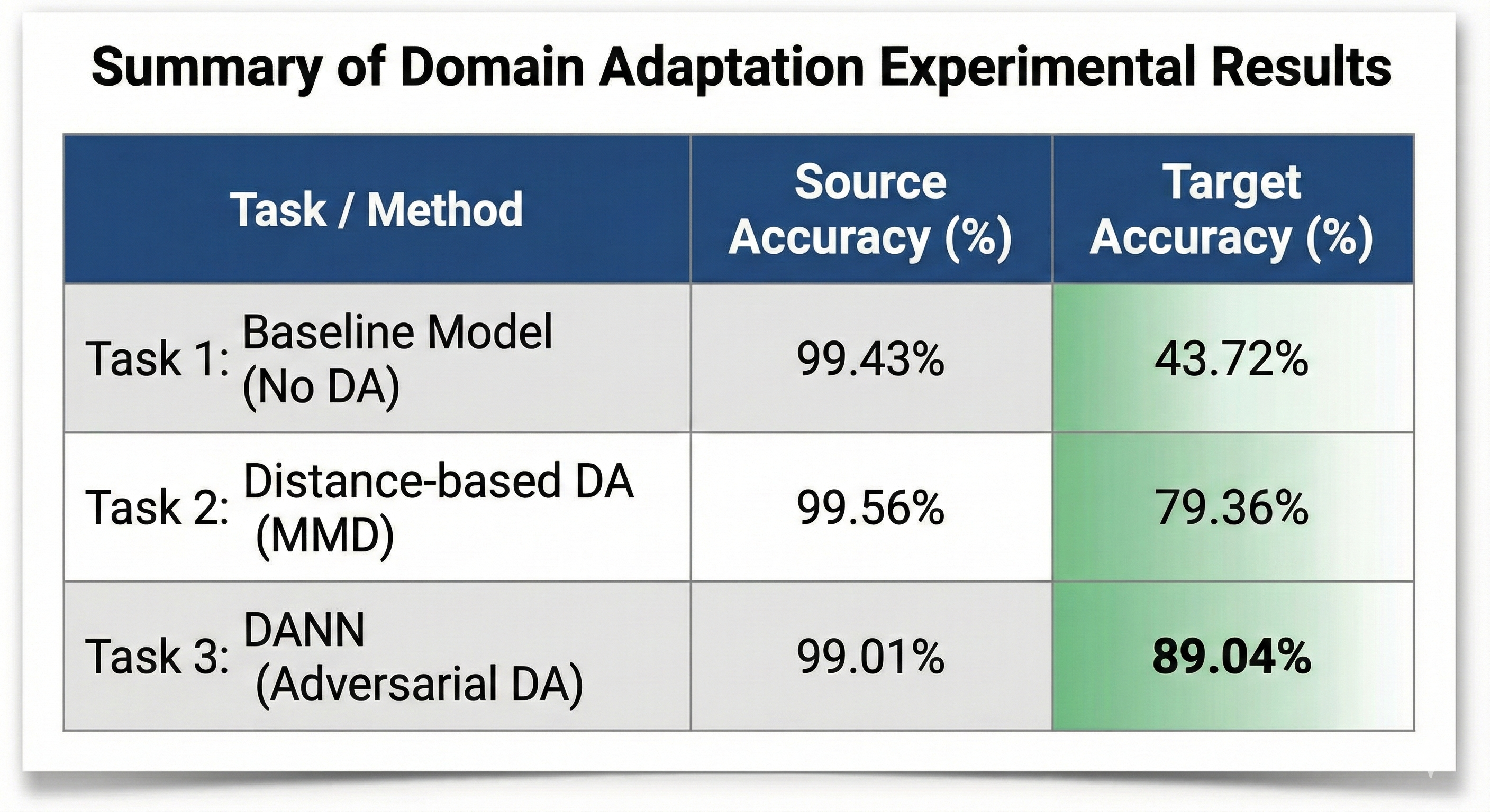 - Results: Performance on MNIST-M jumped from ~43% to ~63%.
